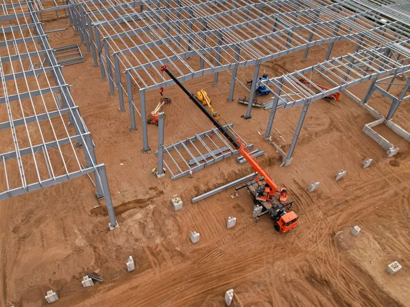 Tērauda komponenti, ieskaitot sijas, kolonnas, breketes un jumta kopnes, ir saliekamas rūpnīcas iestatījumā. Tiek izmantots augstas kvalitātes tērauds, un komponenti tiek izgatavoti, lai precīzi specifikācijas nodrošinātu, ka tās uzstādīšanas laikā precīzi un droši sader. Šī kontrolētā vide ļauj veikt stingrus kvalitātes kontroles pasākumus, nodrošinot komponentu izturību un uzticamību.