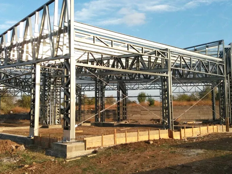 4. Tērauda konstrukciju uzstādīšana Saliekamās tērauda detaļas tiek transportētas uz būvlaukumu un montētas, izmantojot celtņus un citu smago aprīkojumu. Uzstādīšanas process sākas ar kolonnu uzstādīšanu un noenkurošanu pie pamatiem, kam seko siju uzstādīšana, lai veidotu noliktavas karkasu. Pēc tam tiek nostiprinātas jumta kopnes, lai atbalstītu jumta seguma sistēmu.